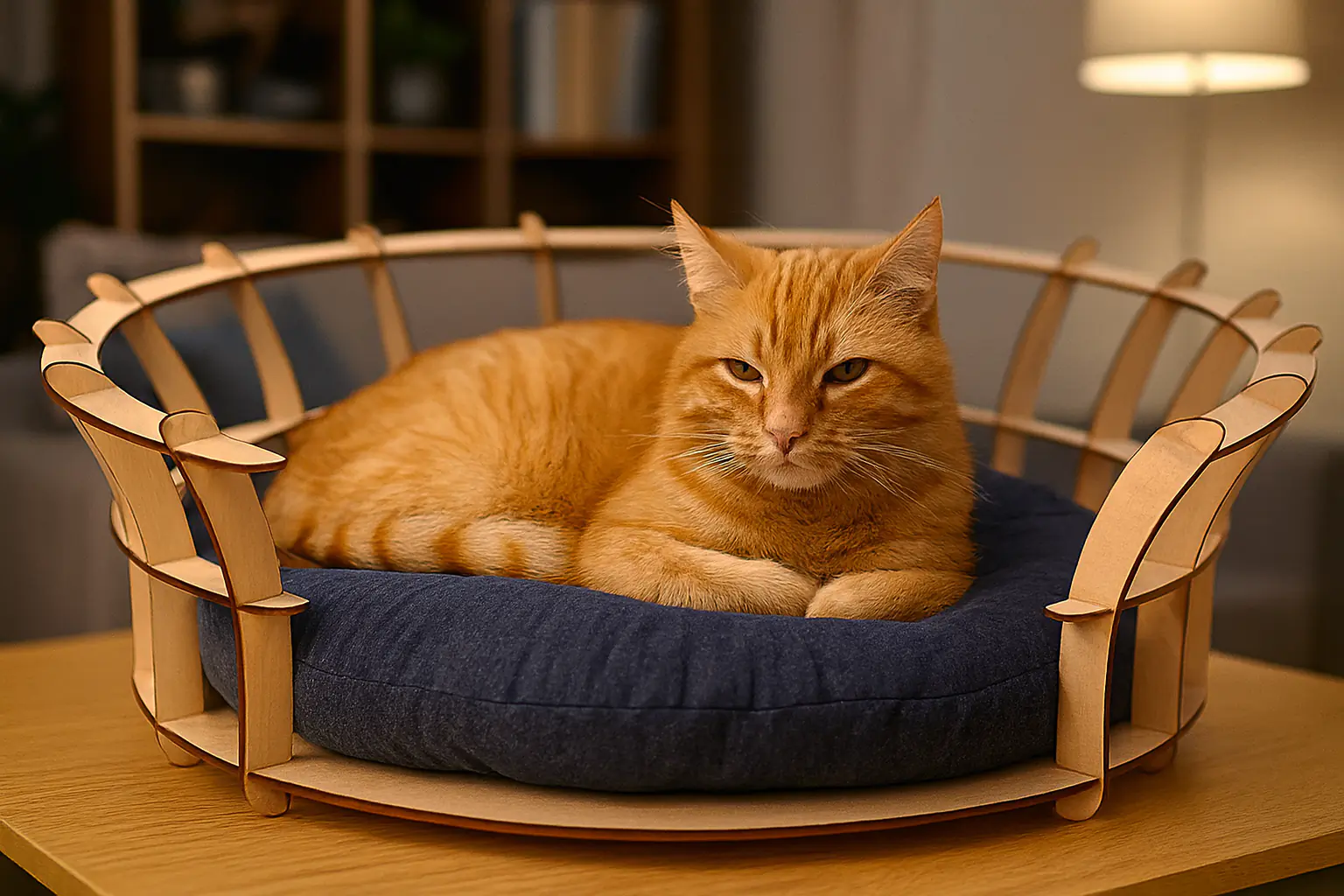 WoodyNest — это минималистичная лежанка из натуральной фанеры, созданная для комфорта и эстетики. Идеально подходит для кошек и мелких собак, она сочетает современный дизайн с экологичными материалами. Круглая форма, изогнутые планки и просторное основание обеспечивают уют и безопасность. Лежанка легко впишется в любой интерьер — от скандинавского до лофта.